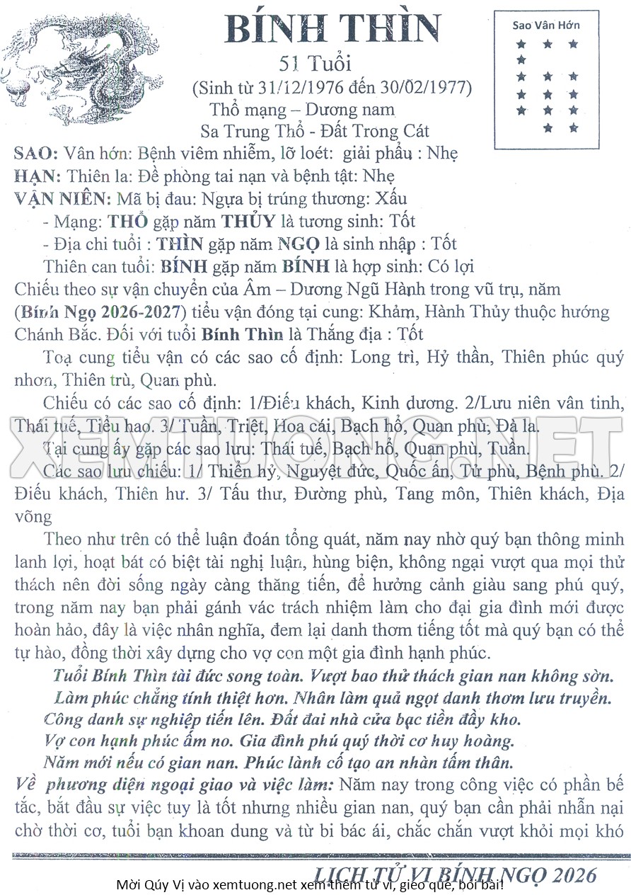 Tử Vi Năm Bính Ngọ 2026 mạng nam BÍNH THÌN