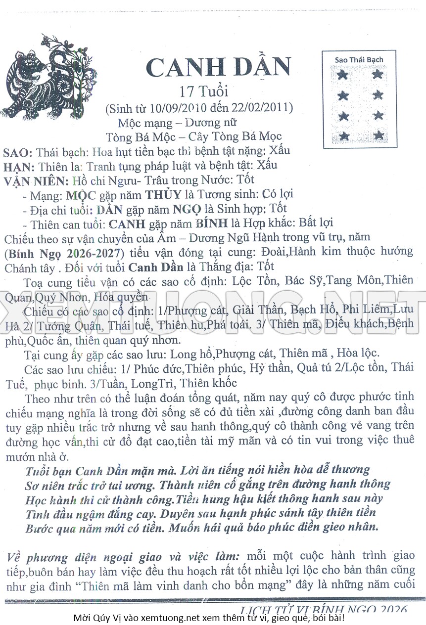 Tử Vi Năm Bính Ngọ 2026 mạng nữ CANH DẦN