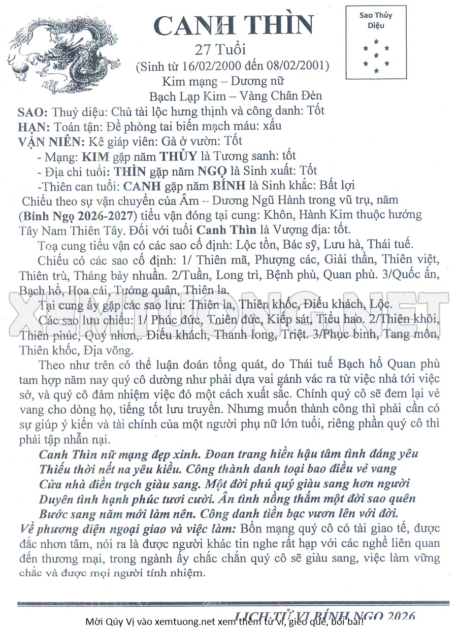Tử Vi Năm Bính Ngọ 2026 mạng nữ CANH THÌN