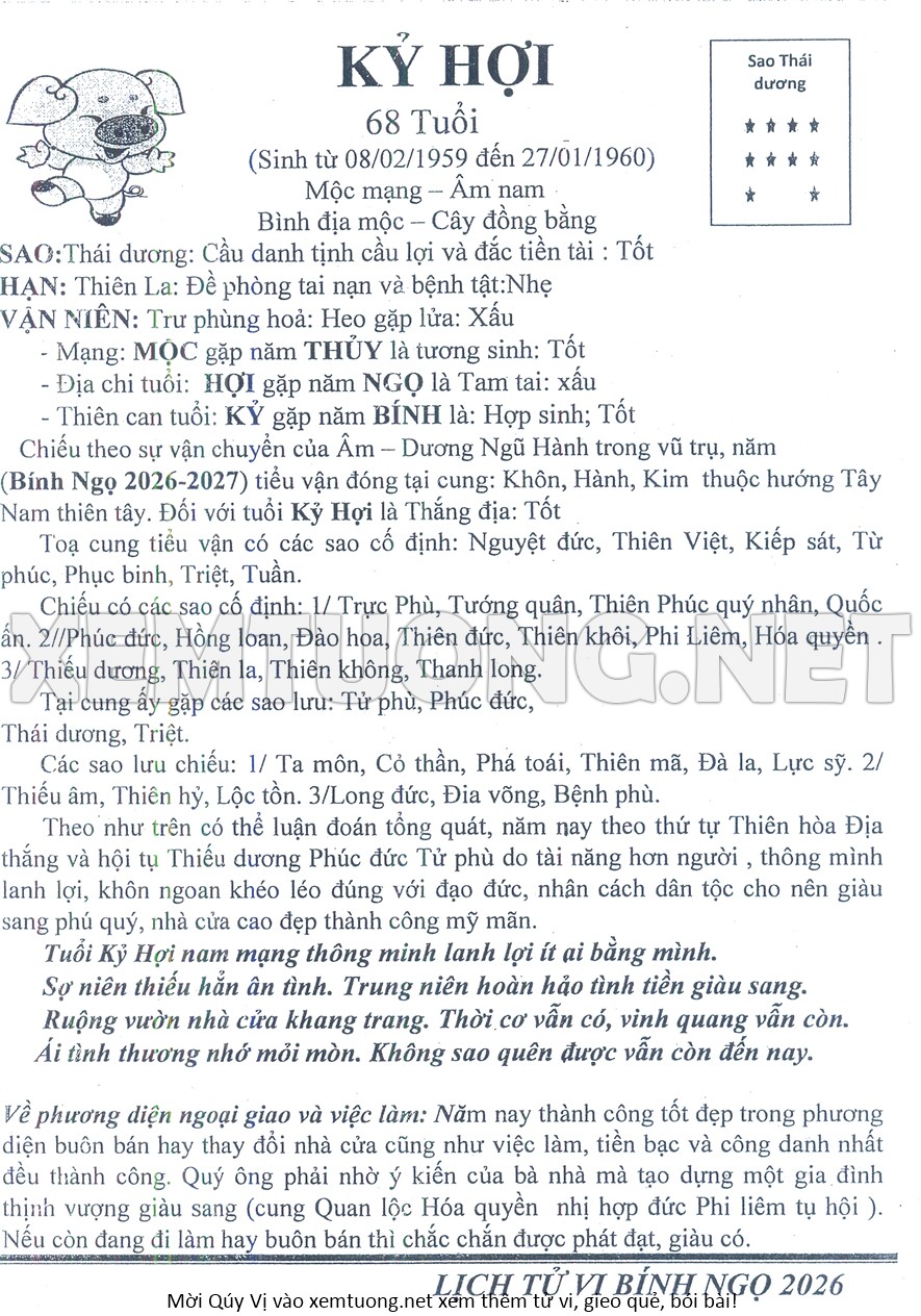 Tử Vi Năm Bính Ngọ 2026 mạng nam KỶ HỢI