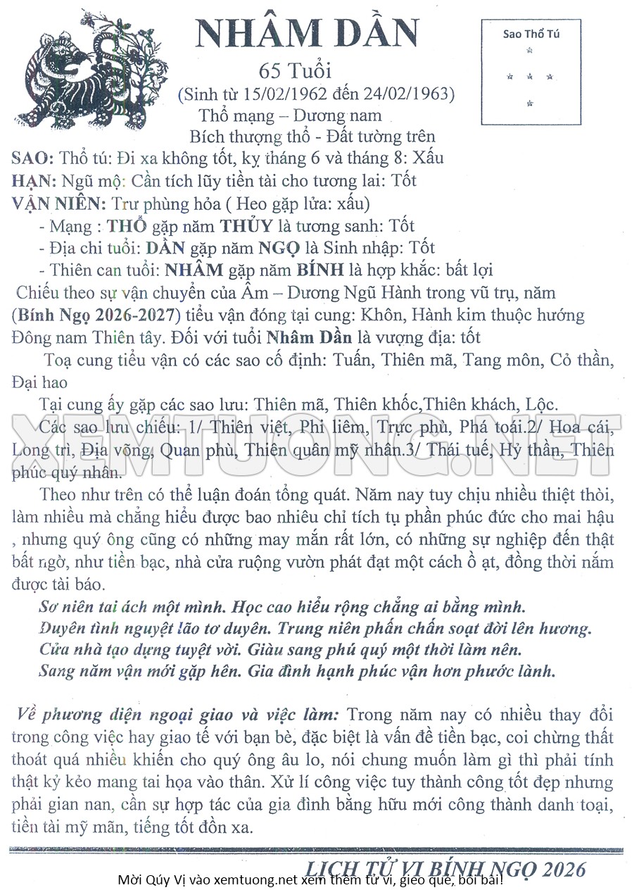 Tử Vi Năm Bính Ngọ 2026 mạng nam NHÂM DẦN